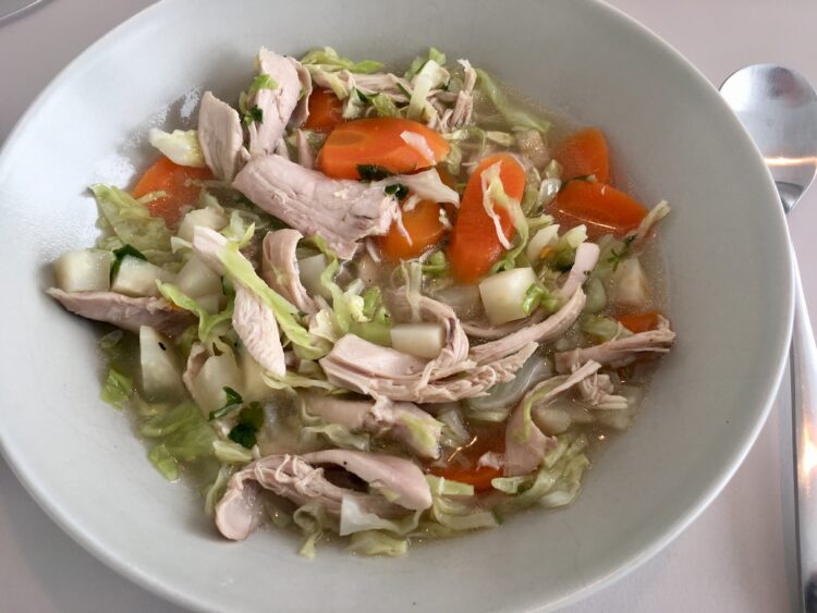 Kom låg på og lad suppen simre i 30 minutter eller til kyllingen slipper benet.